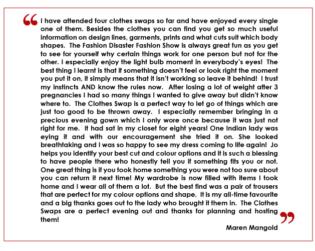 This evening will comprise of a presentation which will be a great review for those who have had either their Colour Analysis and/or Style Solutions Portfolios done. If you have not joined us for any of our workshops or consultations yet, you will benefit from the tips given on dressing your body shape and colours to choose that will suit your skin tone so do come and find out more about us.